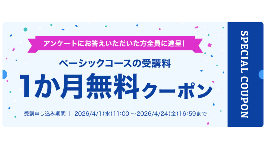 2026年4月24日(金) 16:59まで、アンケート回答で「ベーシックコースが1ヶ月無料」になる特大キャンペーンを実施中です!